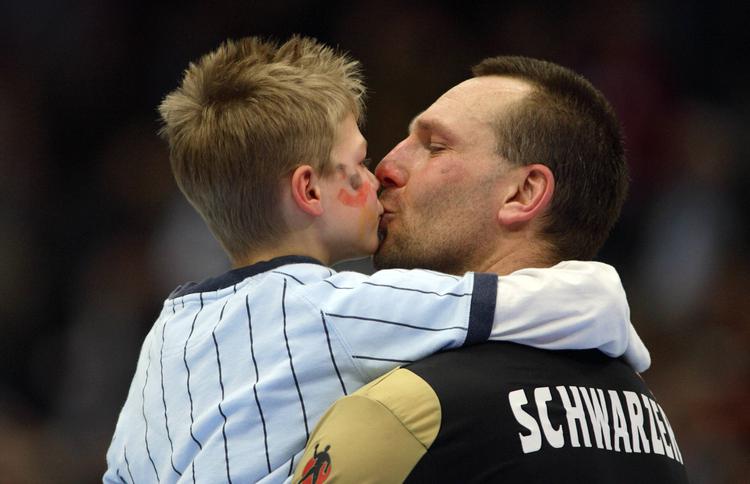 Im Februar 2007 gab es für Christian Schwarzer (rechts) von seinem damals acht Jahre alten Sohn Kian einen Sieger-Kuss. Nun greift Kian Schwarzer selbst in der Bundesliga an. Foto: Imago Images / Camera 4