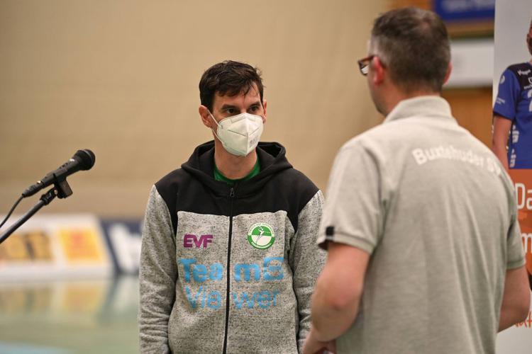 Trainer Nico Kiener (links) und seine Frauen von Frisch Auf Göppingen treffen erst am 15. Mai auf Bayer Leverkusen. Foto: Imago Images / Beautiful Sports