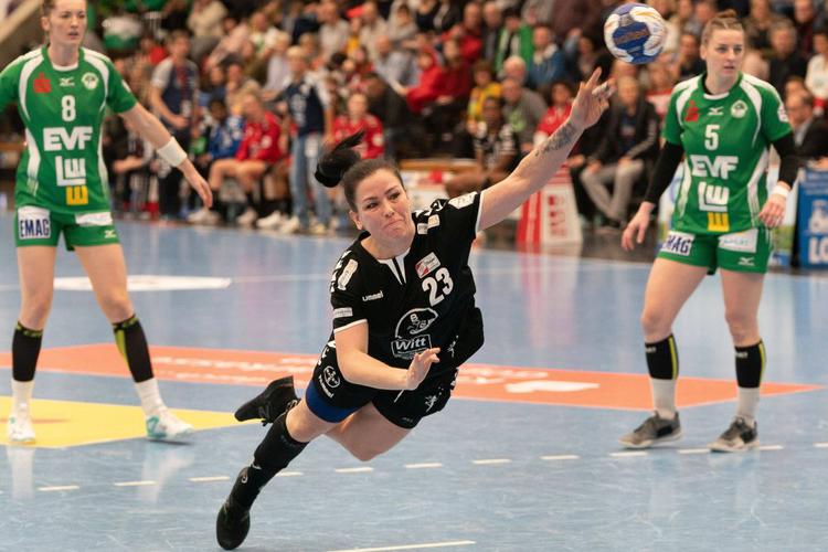 Das ist wie Fliegen: Svenja Huber (Mitte), die hier vor zwei Spielerinnen von Frisch Auf Göppingen zum Wurf kommt, bleibt Bayer Leverkusen treu.