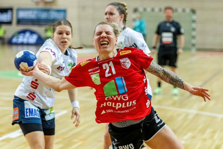Sophie Lütke (Mitte), hier gegen Frisch Auf Göppingen, wechselt im Sommer nach Neckarsulm. Foto: Imago Images / Viadata