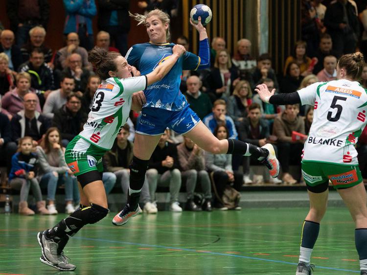 Nathalie Hendrikse (Mitte), hier im Derby gegen Frisch Auf Göppingen, bleibt den Neckarsulmerinnen treu. Foto: Imago Images / Eibner