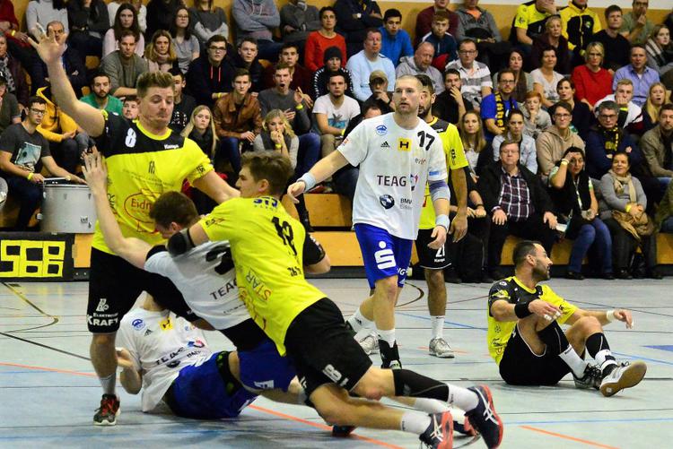 Nichts dem Zufall überlassen, Spannkraft hoch halten, auch vor dem letzten Spiel im Kalenderjahr; Sead Hasanefendic hatte sein Team auch am Samstagvormittag zum Training gerufen, inbegriffen eine nochmalige Videoanalyse. Dem Eisenacher Trainer war das Hinspiel nicht in allzu guter Erinnerung, hatten seine Mannen im ersten Drittliga-Heimspiel der Eisenacher Vereinsgeschichte Mühe, um zu einem 28:25-Erfolg über die SG Bruchköbel zu kommen. Sead Hasanefendic warnte im Vorfeld vor „vielen kleinen flinken Spieler, die im Zweikampf den Torerfolg anpeilen“. Der Eisenacher Trainer hatte seine Crew auch auf eine mögliche offensive Abwehrvariante der Hessen eingestimmt. „Wir wollten dann mit Präzision und hohem läuferischen Aufwand die sich bietenden Freiräume nutzen“, hatte Sead Hasanefendic gefordert. Doch genau das gelang nicht. Mit ihrer leichtfüßigen und zugleich bissigen 5:1-Abwehr bereiteten den Hausherren den Gästen erhebliche Probleme. „Wir fanden einfach keine Lösungen“, ärgerte sich Sead Hasanefendic. In der Abwehr gelangen nicht die Ballgewinne, um – wie zuletzt – zum Gegenstoß anzusetzen. Das Torhüterduell ging klar an Mike Bätz vor der SG Bruchköbel, der nach Glanzparaden in Serie vom eigenen Anhang mit Beifall überschüttet wurde. Für die ThSV-Schlussleute Stanislaw Gorobtschuk und Lars Kremmer wies die Statistik in der Summe gerade einmal 7 parierte Bälle auf. Eisenachs Trainer versuchte mit personellen und taktischen Veränderungen seinem Team zu helfen. Er beauftragte beispielsweise Willy Weyhrauch mit der Rolle als vorgezogene Deckungsspitze, versuchte es zwischenzeitlich mit einer 4: 2-Abwehr, betraute im zweiten Abschnitt Eduard Klyuyko phasenweise mit der zentralen Rolle. Alles ohne den gewünschten Erfolg. Die Hoffnung, wenn sich der gegen den Ligaprimus bis in die Haarspitzen motivierte Gastgeber ausgetobt habe, könne der ThSV Eisenach im Schlussabschnitt das Ruder übernehmen, erfüllte sich nicht. Nach den Ausgleichstreffer vom überwiegend die Kreisposition besetzenden Hannes Iffert zum 21:21 (42.) und Willy Weyhrauch zum 22:22 (43.) patzten die Eisenacher bei eigenem Ballbesitz. Die Hausherren „dankten“ zum 25:22 (45.). In der Schlußviertelstunde gelangen ihnen aber nur drei Treffer. Alexander Saul verwandelte einen an Hannes Iffert verwirkten Siebenmeter zum 27:27 (56.). Eisenachs Kapitän Marcel Schliedermann hatte 40 Sekunden vor der Sirene freigespielt den Führungstreffer auf der Hand, doch SG-Torhüter Mike Bätz war zur Stelle. Sebastian Dietrich traf von den Gastgebern frenetisch bejubelten 28:17. Noch waren 7 Sekunden zu absolvieren. Alexander Saul traf zum vom blau-weißen Team und Anhang umjubelten Ausgleichstreffer.