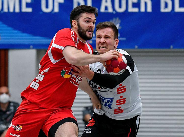 Levi Schwark (links) und sein 1. VfL Potsdam ließen sich von Jannik Ruppert und der HSG Hanau im Hinspiel kaum stoppen. Foto: Imago Images / Patrick Schreiber
