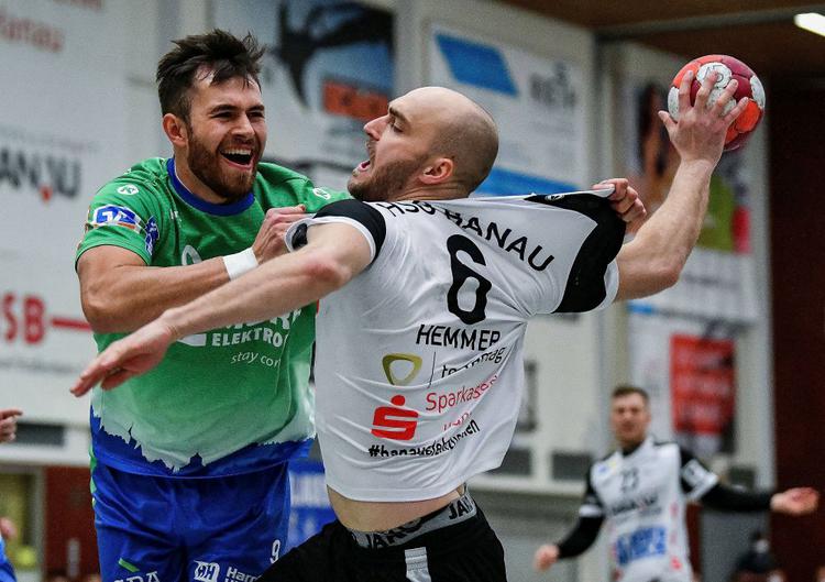 Tim Düren (vom HC Oppenweiler-Backnang, links) und Michael Hemmer von der HSG Hanau trennten sich mit einem 24:24-Remis. Foto: Imago Images / Patrick Schreiber