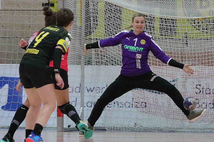 In der Tat sah es Mitte der zweiten Halbzeit nicht danach aus, dass der BVB noch einmal herankommen würde: Nachdem sie den besseren Start erwischt hatten (6:3, 13‘), hielten die Schwarzgelben bis zum 11:13-Halbzeitstand mit. Die äußerst stabile Defensive offenbarte speziell nach dem Seitenwechsel einige Lücken, zudem schlossen die Dortmunderinnen im Angriff zu überhastet ab. Nach Bölks Tor zum 21:13 (43‘) sah es richtig finster aus für den BVB, doch Smits‘ Schützlinge zeigten Moral und kämpften sich zurück. In dieser Phase ragte Rinka Duijndam im Tor heraus, die von 13 Würfen auf ihr Tor zehn abwehren konnte, darunter zwei Siebenmeter. „Wir haben gekämpft bis zum Umfallen. Es ist schade, dass wir uns am Ende nicht belohnt haben. Wir haben in der Phase nach der Halbzeit im Angriff wenig hinbekommen – danach haben wir noch einmal alles reingeworfen. Rinka hat uns dann mit ihren Paraden die zusätzliche Energie gegeben. Ein Riesenkompliment an die Mannschaft für diese Leistung“, sagte Smits nach der Partie.