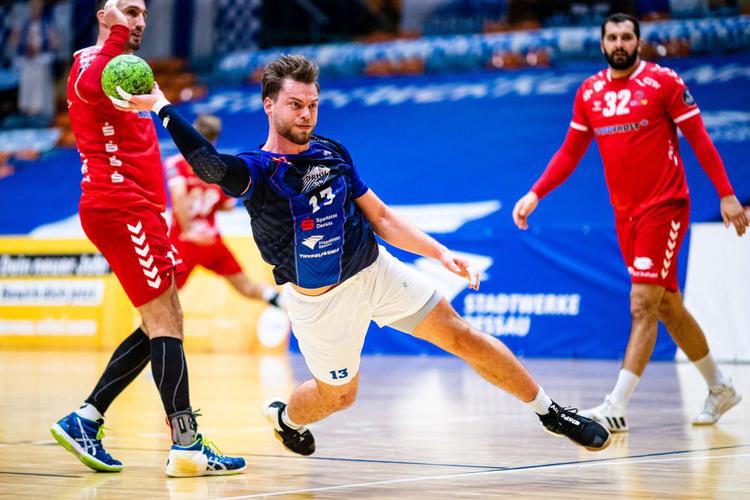 Am Kreis hebt Tim Bielzer (vorne), hier gegen den Wilhelmshavener HV, auch zukünftig für Dessau-Roßlau zum Torwurf ab. Foto: Imago Images / Hartmut Bösener