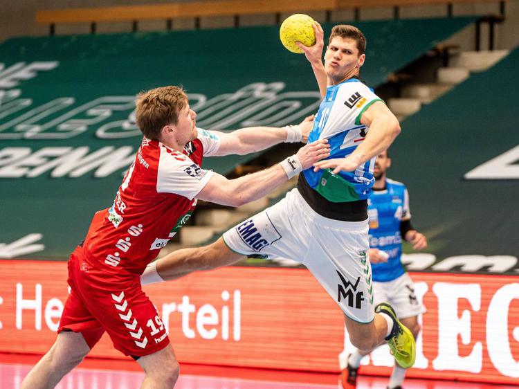 Sebastian Heymann (rechts), hier gegen den Nordhorner Luca de Boer, bleibt Frisch Auf Göppingen treu. Foto: Imago Images / Eibner