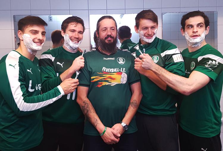 Lucas Krzikalla, Lukas Binder, Yves Kunkel und Peter Strosack beim Rasieren, zusammen mit DHfK-Fan Thomas vom Fanclub Feuerball L.E., der sich extra für die Movember-Kampagne seinen "Aufstiegsbart"aus dem Jahr 2015 abrasieren ließ (Quelle: SC DHfK).
