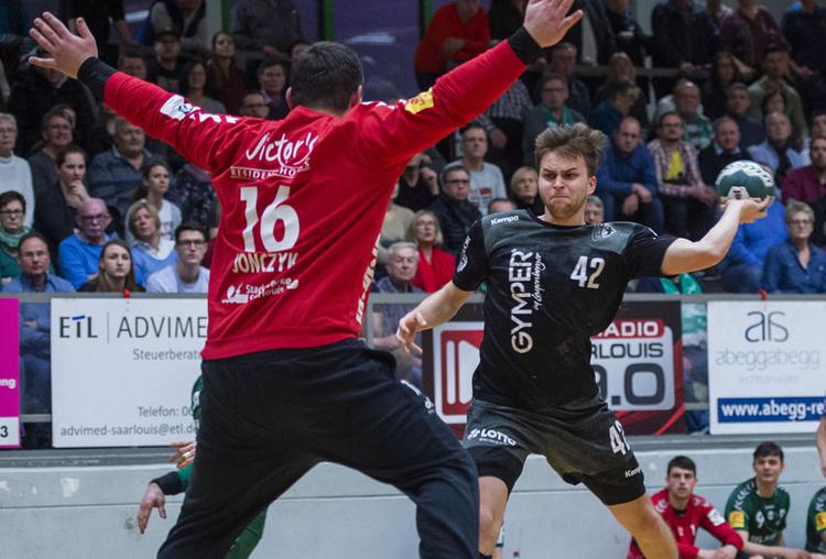 Die Anfangsphase der 2. Hälfte ist ausgeglichen. Die Pfälzer kontrollieren ihren Vorsprung, lassen die Saarländer nicht näher kommen. Und dann kommen die zehn Minuten, in denen die HGS, das Ding sogar noch hätte umdrehen können. Max Hartz ist der Mann dieser Spielphase. Zuerst netzt er vom Punkt zum 16:21 (42.), dann findet sein präzises Anspiel Julian Kreis und der macht das 17:21 (43.). Gleich darauf tritt er wieder zum Siebenmeter an und versenkt zum 18:21 (45.). Jetzt wird es in der Stadtgartnhalle auch wieder richtig laut. Aber fast vier Minuten lang gelingt keinem Team ein Treffer. Das schönste Tor des Abends folgt in der 49. Minute, als Leist zum Kempa-Treffer auf Hartz passt: 19:21. Als dann auch noch Darius Jonczyk einen „Freien“ aus dem Nahbereich pariert und Gilles Thirry zum 20:21-Anschluss trifft, kocht die Halle.