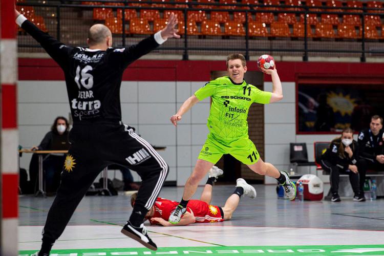 Felix Karle (rechts), hier gegen Torwart Aljosa Rezar von Nettelstedt-Lübbecke, hat sich langfristig an die Rimparer Wölfe gebunden. Foto: Imago Images / Noah Wedel