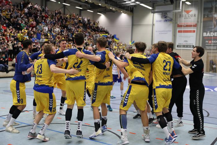 Mit völlig durchtränkter Kleidung und nassem Haar kam Jörg Lützelberger aus der Kabine Richtung Pressekonferenz. Die Flüssigkeit war deutlich am Geruch zu erkennen: die Bierdusche hatte den HSG-Coach gnadenlos erwischt. „Da sieht man, wie naiv ich als junger Trainer manchmal noch bin“, lachte er. „Ich versuche immer auf alles vorbereitet zu sein, aber das habe ich nicht kommen sehen und antizipiert. Ich dachte, wir stoßen an…aber ich sitze ja am längeren Hebel und kann das zurückgeben.“ Die Stimmung nach dem hart erkämpften 26:25-Sieg gegen den bisherigen Tabellenvierten war ausgelassen. Dabei boten die beiden Mannschaften vor richtig stimmungsvoller Kulisse den begeistert mitgehenden Fans nochmal alles, was Handball zu bieten hat.