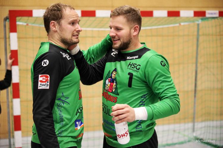 Zusammmenhalt und Stabilität in der Deckung sowie auf der Torwartposition (Simon Tölke links und Maximilian Wolf) sollen auch in Oppenweiler der Schlüssel für die HSG Konstanz sein. (Foto: Michael Elser)