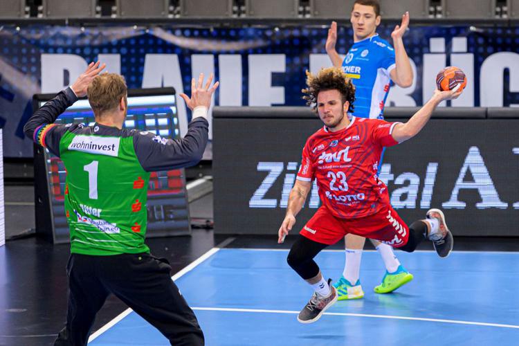 Pascal Durak (vorne rechts), hier gegen Torwart Johannes Bitter vom TVB Stuttgart, bleibt Ludwigshafen treu. Foto: Imago Images / Wolf-Sportfoto