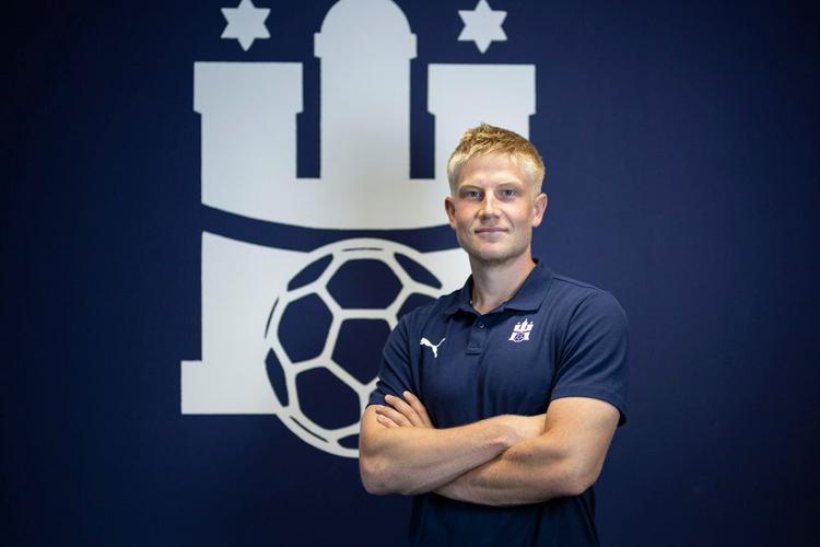 Frederik Bo Andersen vor dem Wappen seines neuen Vereins. Foto: Handball Sport-Verein Hamburg