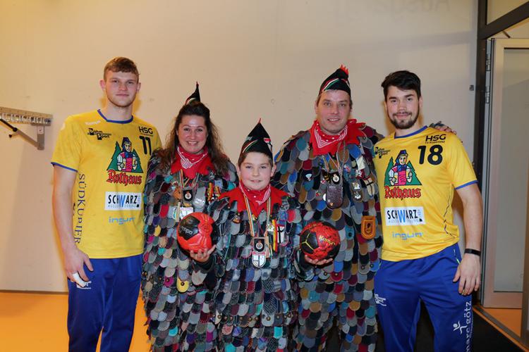 An Fasnacht gemeinsam am Ball: Jonas Löffler, Familie Degler von den Blätzlebuebe Konstanz (Ellen, Sohn Leon und Markus) sowie Manuel Both von der HSG Konstanz. (Foto: Peter Pisa)