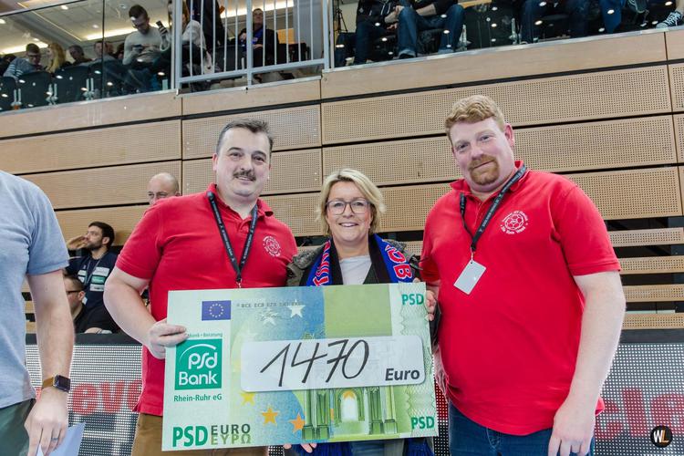 Insgesamt kamen stolze 1470 Euro dabei zusammen, die in Form eines Schecks (gestiftet von Vikings-Partner PSD Bank Rhein-Ruhr eG) überreicht wurde. Der Spendenbetrag setzt sich aus einer erfolgreichen Sammelaktion des Fanclubs, 500 Euro eines anonymen Spenders sowie 500 Euro von Frau Christine Gadow zusammen, die für diesen Preis ein signiertes Trikot des deutschen Rekordmeisters THW Kiel ersteigert hatte, welches vom HC Rhein Vikings zur Verfügung gestellt worden war.