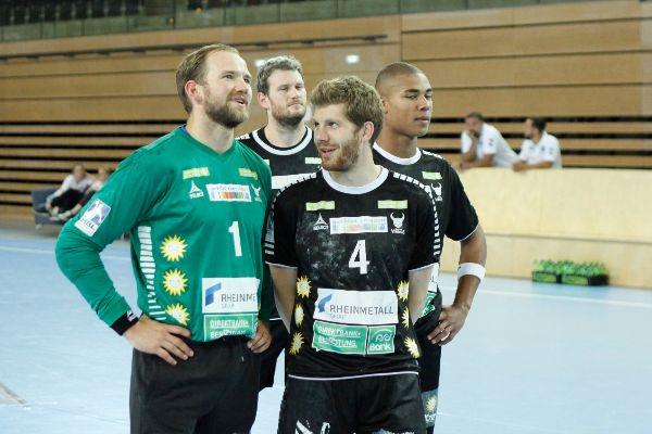 Es wird das letzte gemeinsame Spiel für die Handballer vom HC Rhein Vikings werden: Mikkel Moldrup, Bennet Johnen, Christian Hoße und Daniel Zwarg (von links nach rechts) verlassen den Zweitliga-Absteiger zur kommenden Saison. (Foto: René Haude)