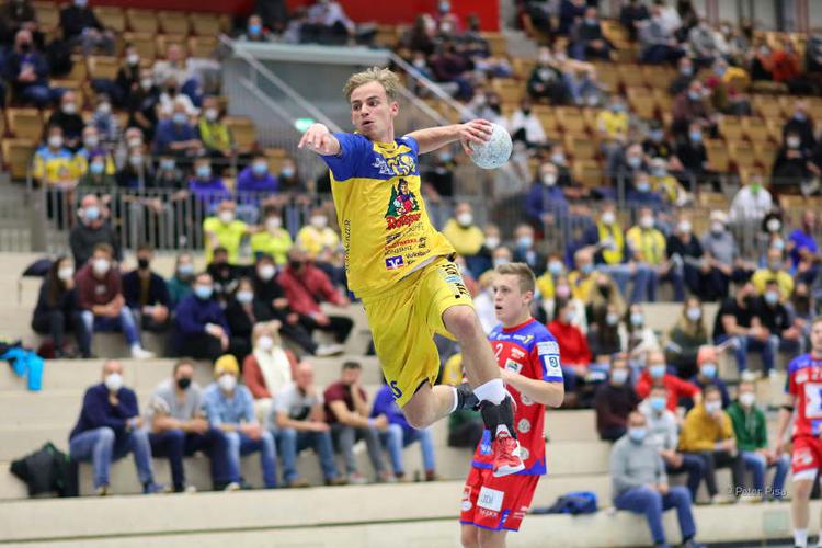 So geschehen vor allem in der zweiten Hälfte. In der ersten hielt seine Mannschaft gut mit und ließ sich lange nicht wirklich abschütteln. So wie etwa nach dem 4:1 durch David Knezevic, das Moritz Bittner mit dem Anschlusstreffer zum 5:6 konterte. Kurz darauf, gespielt waren noch nicht einmal ganz zwölf Minuten, musste Konstanz die Rote Karte für Niklas Ingenpaß nach einem Kontakt mit dessen in der Luft befindlichen Gegenspieler Dennis Hartmann verdauen. Doch auch in Unterzahl war die HSG an diesem Abend mehrfach erfolgreich. In der Folge zeigte Jannes Timm, Neuzugang aus Hamburg, der in den ersten Wochen der Saison noch unter Verletzungsproblemen litt, was er kann. Genauso wie Joel Mauch, der über weite Stecken das Spiel der Konstanzer dirigierte und selbst mit einigen schönen Schlagwürfen erfolgreich war. Vor der trotz der ganzen Einschränkungen und Hürden beachtlichen und sehr stimmungsvollen Kulisse legten die immer konsequenter werdenden Gastgeber zur Pause ein 19:13 vor.