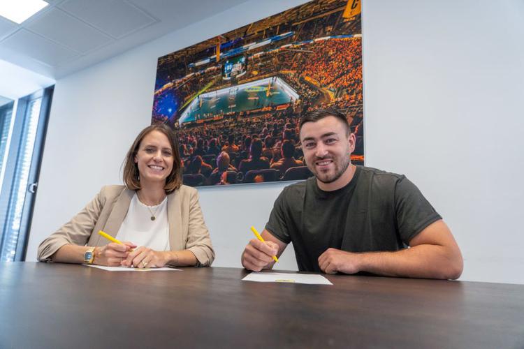 Löwen-Geschäftsführerin Jennifer Kettemann und Jannik Kohlbacher bei der Vertragsunterschrift. Foto: Rhein-Neckar Löwen