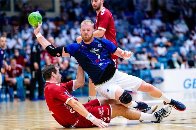 Bis Libor Hanisch (im blauen Trikot) wieder so zum Torwurf abheben kann, wird noch etwas Zeit vergehen. Foto: Imago Images / Hartmut Bösener