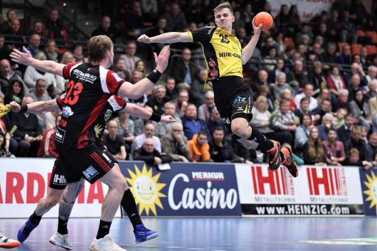 Jakob Knauer (rechts), hier gegen Valentin Spohn vom TuS Nettelstedt-Lübbecke, bleibt beim HSC 2000 Coburg. Foto: Imago Images / Eibner