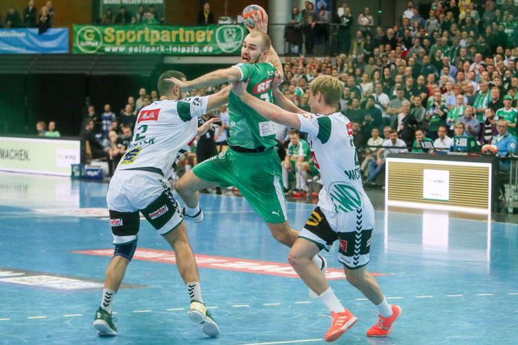 Maximilian Janke (Mitte), hier im Dreikampf mit zwei Spielern des TSV GWD Minden, verlässt Leipzig sofort. Foto: Imago Images / Picture Point LE