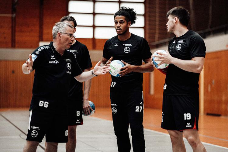 Konzentriert verfolgen die MT-Neuzugänge André Gomes und Elvar Örn Jonsson die Instruktionen von Chefcoach Gudmundur Gudmundsson. (Foto: Alibek Käsler)