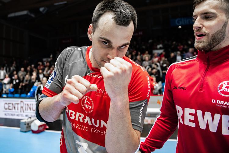 Auch nach der nächsten Mindener Auszeit war einer ganz obenauf: Parade Nummer 13 entfachte begeisterte „Simo, Simo“-Sprechchöre auf den Rängen. Zweimal war jedoch auch Leon Grabenstein obenauf, so dass Andreas Cederholm, Mats Korte per Gegenstoß sowie Magnus Gullerud auf 20:16 verkürzen konnten (42.). Dann war wieder Grabenstein zur Stelle und Max Staar machte die Partie noch enger. Glück für die MT, dass Felix Danner sich das Leder mitten aus dem Passspiel der Mindener herauspflückte, Finn Lemke bediente und der im Alleingang den 0:4-Negativlauf mit dem 21:17 beendete (45.).