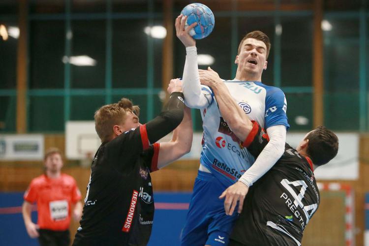Augen zu und durch: Marko Matijašević (MItte), hier gegen Fürstenfeldbruck, verlässt Großwallstadt im Sommer. Foto: Imago Images / HMB-Media