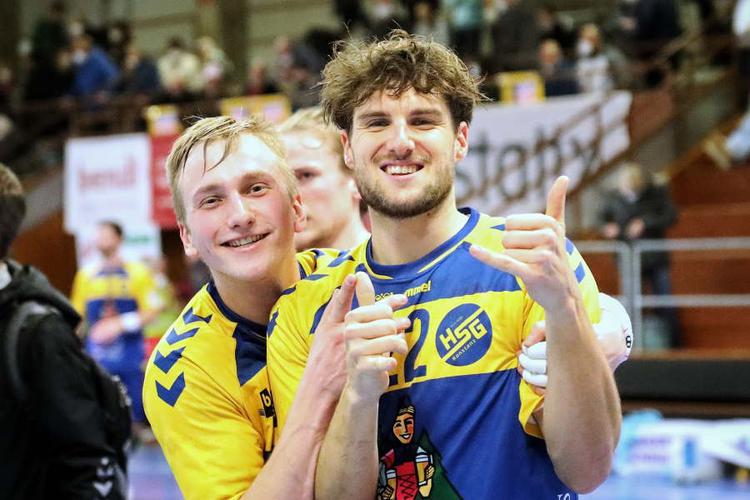 Kein Wunder, dass sie nun alle um die Wette strahlten. Im Bewusstsein, dass nun erst die ganz schweren Prüfsteine warten werden. Die letzten Prüfungen an der Uni. Und vor allem die ganz großen Spiele im Kampf um die Rückkehr in die 2. Bundesliga. Lützelberger zog ein „extrem positives Fazit. Wir haben ganz, ganz wenige Fehler gemacht und ganz viel von dem, woran wir speziell seit unserem Impuls-Trainingscamp arbeiten, umgesetzt.“ Gerade neue Elemente im Kreisläuferspiel waren sehr erfolgreich. „Harte Arbeit zahlt sich aus. Vor allem, wenn die handballerische Qualität an der du arbeitest, auf die richtige emotionale Herangehensweise trifft.“ Der Mannschaft sprach er ein großes Lob dafür aus, dass es gelang noch effizienter zu spielen und „sie mit einer fantastischen Einstellung in das Spiel gegangen ist. Das haben sie von der mentalen Seite über 60 Minuten gut gemacht und durchgezogen. Ein tolles Team, eine tolle Teamleistung.“ Eine Schippe draufzulegen hatte der 33-Jährige gefordert. Seine Schützlinge lieferten, obwohl einige angeschlagen auf die Zähne beißen mussten. Bewegt hatte ihn die Unterstützung des mit rund 40 HSG-Fans gefüllten Gästefanblocks. Lützelberger: „Unser Fanclub ist einfach der Hammer. Es war so schön, den Moment nach dem Spiel mit ihnen zu feiern und in diesem Freudentaumel die Nachricht zu bekommen, dass wir uns schon für die Aufstiegsrunde qualifizieren konnten. Da haben alle nur ein Lächeln im Gesicht gehabt. Für dieses erste Ziel haben wir viele Monate gearbeitet. Jetzt gehen wir auf das nächste Ziel.“ Heißt: Am Samstag, 20 Uhr, kann sein Team mit einem neuerlichen Erfolg gegen Kornwestheim Platz eins festzurren.
