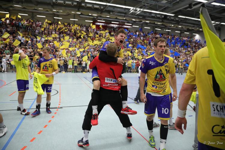 Während Empor in den bitteren Apfel des Verbleibs in der 3. Liga beißen muss, lagen sich die beiden Konstanzer Kapitäne Tim Jud und Tom Wolf in den Armen. Das kongeniale Duo, das seine Mannschaft in die „stärkste zweite Liga“ zurückgeführt hat, bekam das Dauergrinsen nicht mehr aus dem Gesicht und wollte sich gar nicht mehr loslassen. Im Hintergrund spielten sich ähnliche Szenen zwischen Cheftrainer Daniel und Präsident Otto Eblen ab. Ganz viel Anspannung wich dabei langsam unbeschreiblicher Freude und Zufriedenheit. Den auf ihm lastenden Druck brachte Daniel Eblen so zum Ausdruck: „Mit der Relegation hat es sich angefühlt wie mit einem Staatexamen, das man vor sich hat. Man arbeitet ewig darauf hin – und dann ist es auch gut, wenn es vorbei ist.“ Tom Wolf wusste bis weit nach dem Spiel nicht, wohin mit seinen Gefühlen. „Was hier in der Halle abgegangen ist, das fühlt sich einfach super an. Wir sind super glücklich.“ Er hatte den Satz nicht einmal beendet, da folgte schon die zweite Bierdusche kurz hintereinander. „Alle feiern, alle freuen sich, so muss es auch sein“, strahlte der Mittelmann. „Wir haben es uns heute verdient.“