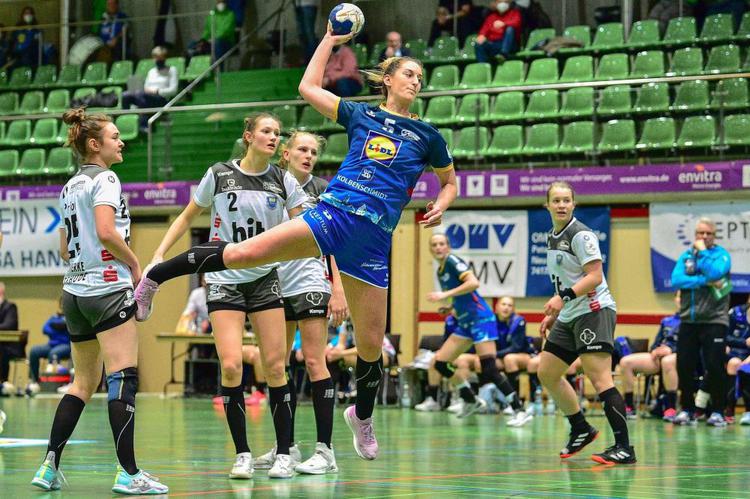 Sara Senvald (am Ball), hier noch im Trikot der Neckarsulmerinnen gegen den Buxtehuder SV, wird zu einem anderen Verein wechseln. Foto: Imago Images / Foto2press