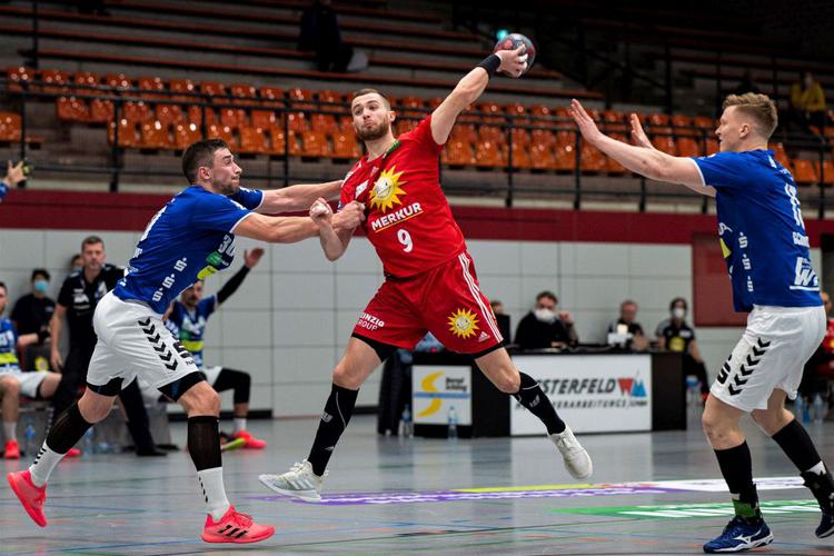 Dominik Ebner (Mitte), hier gegen den EHV Aue, bleibt bei Nettelstedt-Lübbecke. Foto: Imago Images / Noah Wedel