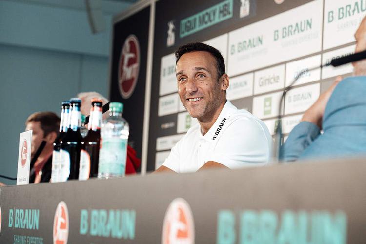 Unter großem Medieninteresse von Presse, Funk und Fernsehen hat Handball-Bundesligist MT Melsungen am Mittwochnachmittag ihren neuen Mann an der Seitenlinie vorgestellt. Mit Roberto García Parrondo (alle Fotos: A. Käsler) gelang es den Nordhessen, einen international viel beachteten und gefragten Trainer an die Fulda zu holen. „Unsere kurzfristige Suche nach einem neuen Coach war sicher mit einem gewissen Zeitdruck verbunden. Aber wir hatten uns selbstverständlich vorher bereits Gedanken gemacht, was passieren würde, wenn gewisse Entwicklungen eintreten“, sagte Vorstand Axel Geerken auf der kurzfristig anberaumten Pressekonferenz in den Räumen der Kasseler Rothenbach-Halle, wo Roberto Garcia Parrondo bereits am Donnerstag im Spiel gegen HBL-Tabellenführer SC Magdeburg seinen Einstand geben wird.