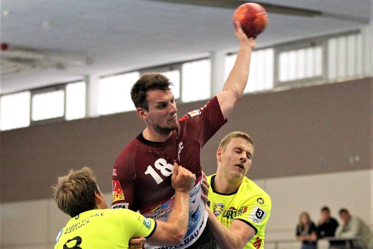 Domenic Kehl (Mitte), hier gegen zwei Spieler des HC Empor Rostock, beendet seine Karriere. Foto: Imago Images / Eibner