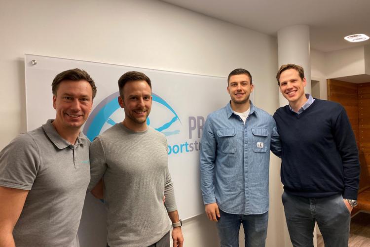 (v.l.n.r.): Dr. med. Marcus Schönaich (Mannschaftsarzt), Timm Kostrzewa (leitender Physiotherapeut), Filip Kuzmanovski, Sven-Sören Christophersen (sportlicher Leiter) (Foto: Die Recken)
