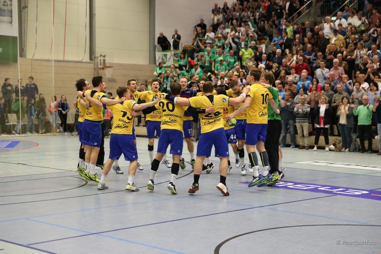 Von der ersten Minute an lag die HSG Konstanz in Front, immer wieder mit bis zu fünf Toren. Dann der Schreckmoment: Emsdetten kämpfte sich nach einer Umstellung vom 6:0 hin zu einer offensiven 3:2:1-Abwehr langsam heran. Konstanz beging einige leichte Fehler und begann zu zittern. Erst recht, als beim Stand von 33:30 in Unterzahl der Ball verloren wurde und der niederländische Nationalspieler Jasper Adams sich den Ball eroberte. Freie Bahn für den achtfachen Torschützen, der knapp hinter der Mittellinie auf das leere Tor der HSG abzog. „In dem Moment hatte ich schon die Erinnerungen an Hildesheim im Kopf“, meinte HSG-Torwart Maximilian Wolf. „Und das sind nicht die schönsten Erinnerungen.“ Doch der Ball klatschte an den Pfosten und von dort ins Seitenaus. „Ab da habe ich gedacht, dass wir heute nicht verlieren können, weil etwas auf unserer Seite ist, dass es nicht schief gehen kann.“ Kurz darauf setzte sich Paul Kaletsch gegen die offene Deckung der Gäste durch und traf zum 34:31. Die Schänzlehölle kochte, der Sieg der HSG Konstanz stand endgültig fest.