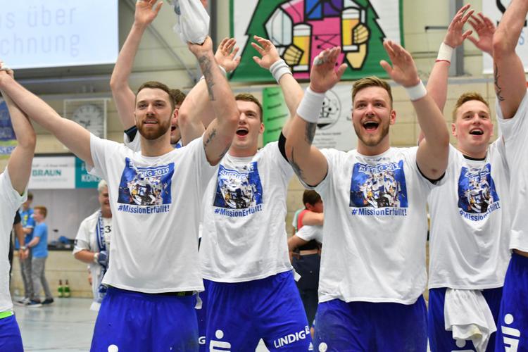 Der ThSV Eisenach ist zurück in der 2. Handballbundesliga. Hier jubeln in Konstanz Alexander Saul, Hannes ffert, Justin Mürköster und Jonas Richardt - Foto: L. Reißmüller