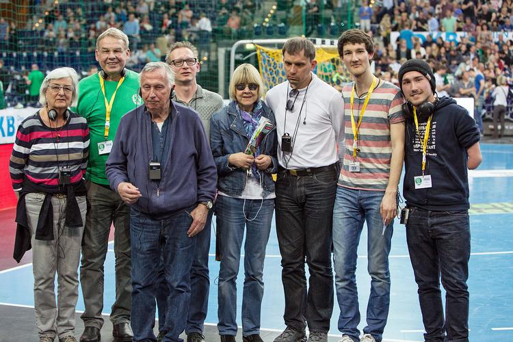 Die Reporter der DHfK-Audiodeskription und einige sehbehinderte Handballfans bei einem Bundesligaspiel in der ARENA Leipzig. Foto: Karsten Mann